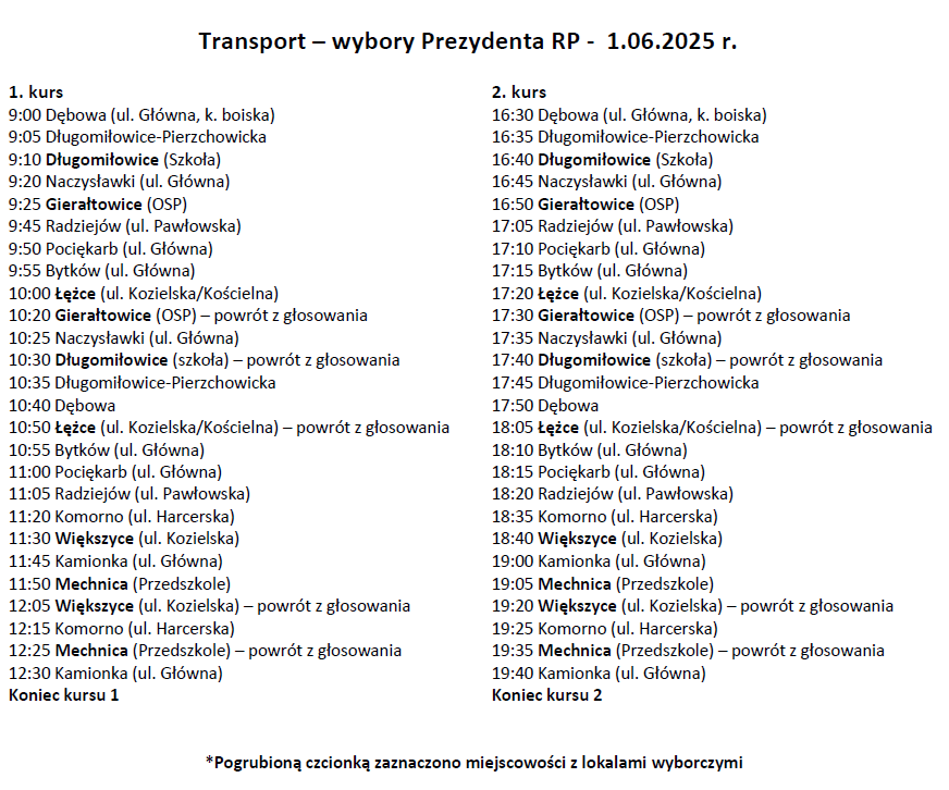 Gmina Reńska Wieś, we współpracy z GTV Bus, zapewnia w dniu wyborów 01 czerwca 2025r. bezpłatny transport do lokali wyborczych w ramach dwóch kursów.
