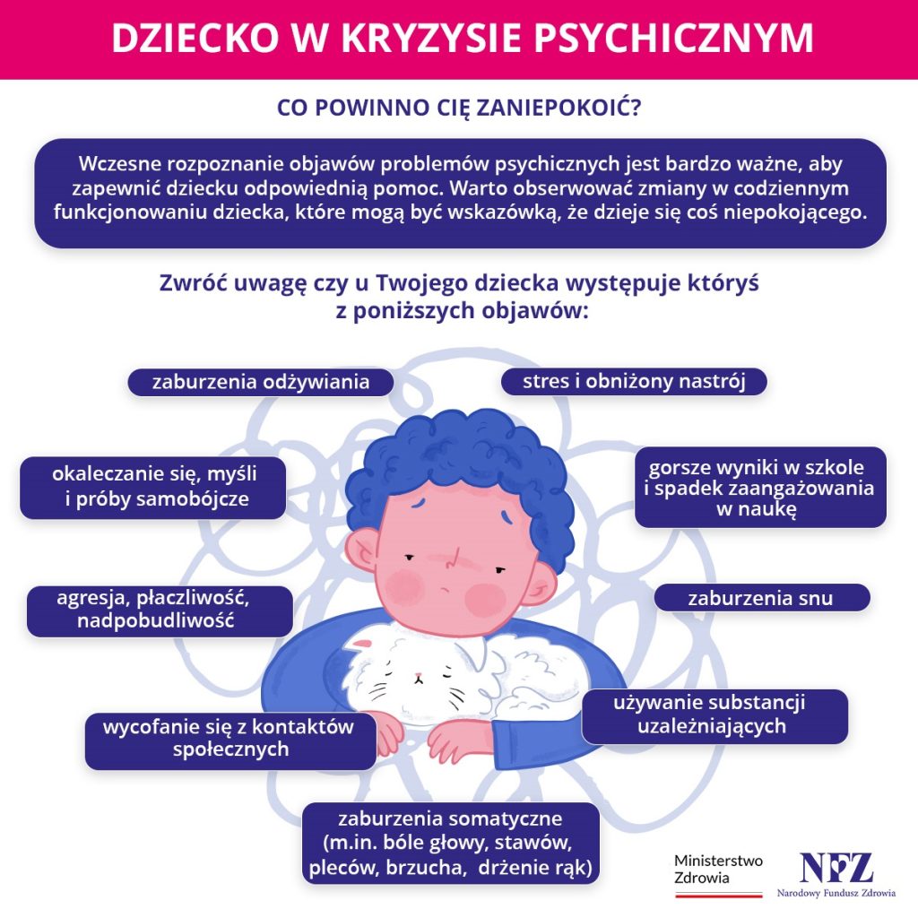Pierwsze oznaki, że z dzieckiem dzieje się coś złego łatwo przeoczyć. Dzieci często nie potrafią w odpowiedni sposób wyrazić słowami co im dolega, z czym sobie nie radzą, dlatego uciekają m.in. w zachowania, które mają zwrócić na nie uwagę dorosłych lub rówieśników. Młodość to okres buntu i wiele zachowań kładziemy na karb dojrzewania. Zdarza się, że po pomoc zgłaszamy się dopiero wtedy, kiedy załamanie zdrowia psychicznego się pogłębiło. Gdy pojawiają się samookaleczenia, alkohol, narkotyki, odmowa chodzenia do szkoły, próby samobójcze. Dlatego tak ważne jest, aby być czujnym i nie bagatelizować żadnych niepokojących symptomów.