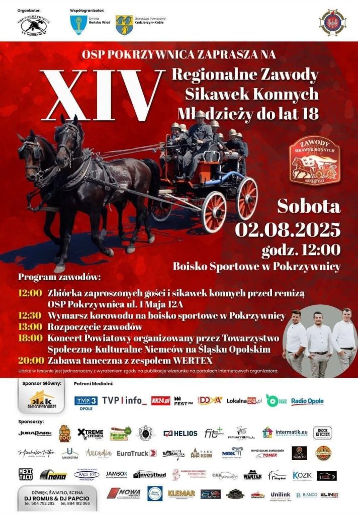 OSP Pokrzywnica zaprasza od 13:00 na boisko sportowe na Regionalne Zawody Sikawek Konnych Młodzieży z mnóstwem atrakcji i dobrej zabawy.