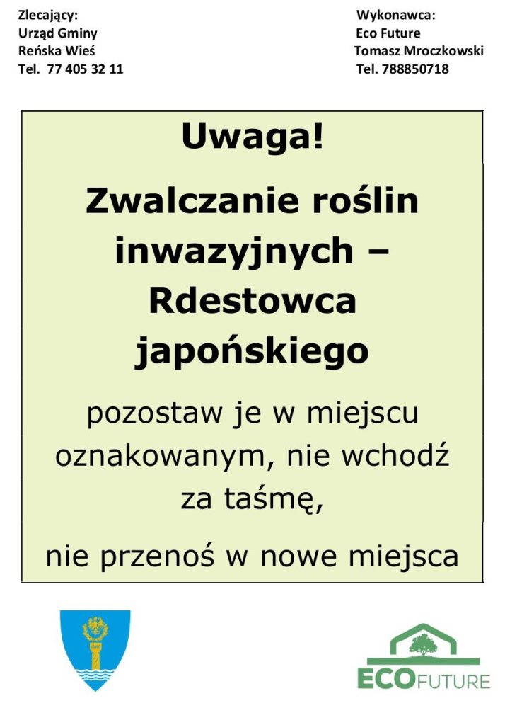 Informujemy, że w sobotę (16.08) od wczesnych godzin rannych, prowadzone będą w Sołectwie Reńska Wieś w „wąwozie” na ścieżce rowerowej Szlakiem Kolejowym (na wysokości ul.Dworcowej i Lipowej) prace związane z chemicznym usuwaniem stanowiska rośliny inwazyjnej – Rdestowca japońskiego. Roślina ta nie jest trująca, ale jest wpisana na listę gatunków inwazyjnych IGO i podlega bezwzględnej eliminacji z naszej biosfery. Prosimy:
