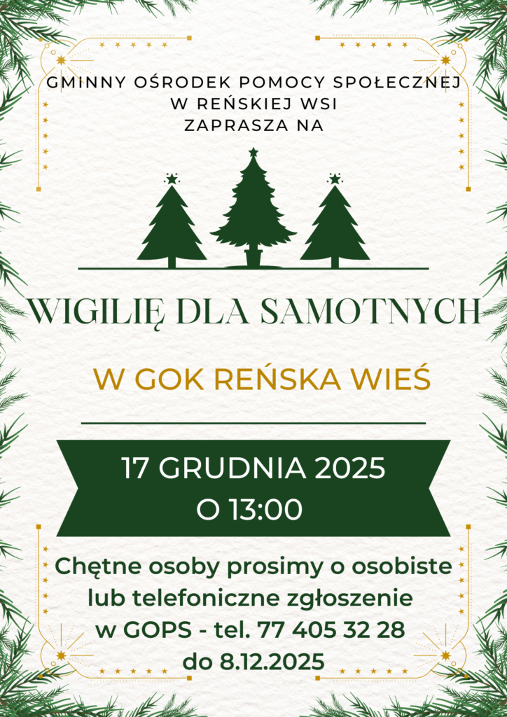 Spotkanie wigilijne dla samotnych mieszkańców Gminy Reńska Wieś odbędzie się 17.12.2025 o godz. 13:00 w Gminnym Ośrodku Kultury w Reńskiej Wsi.
