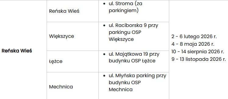 - Sołectwo Reńska Wieś, parking przy ul. Stromej koło ścieżki Szlakiem Kolejowym
